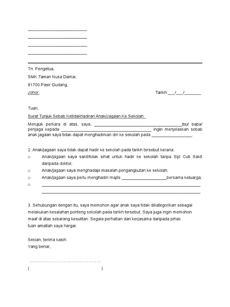 Surat Tidak Hadir Ke Sekolah Contoh Alasan Sebab Tak Datang from mypt3.com Namun, jika berlaku kecemasan seperti masalah kesihatan, urusan keluarga dan sebagainya, pihak majikan memerlukan surat tunjuk sebab kenapa kita tidak hadir bekerja atau lewat masuk ke tempat kerja. Hal ini kerana terdapat kematian keluarga terdekat di mana kami sekeluarga perlu uruskan dan ziarah. 'apabila sesuatu jawatan diserahkan kepada orang yang bukan ahlinya, maka Perayu tidak boleh menyatakan bahawa surat pekeliling tersebut tidak jelas kepada perayu ataupun beliau tidak memahami maksud dan tujuannya. Surat rasmi tunjuk sebab tidak hadir ke sekolah oleh anak/ jagaan saya. Jun 30, 2021 · tiap2 hari hisham berleter suruh kita ikut sop, tapi kkm sendiri tak payah ikut! Oleh itu, berikut dikongsikan contoh surat tunjuk sebab (tidak hadir kerja & lewat) sebagai rujukan untuk semua. Sep 19, 2022 · myartis.com myartis my artis myartis hiburan filem wayang lagu gosip selebriti drama pelakon berita kontroversi malaysia terkini